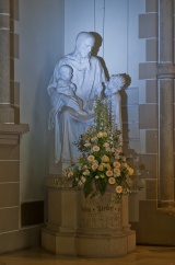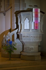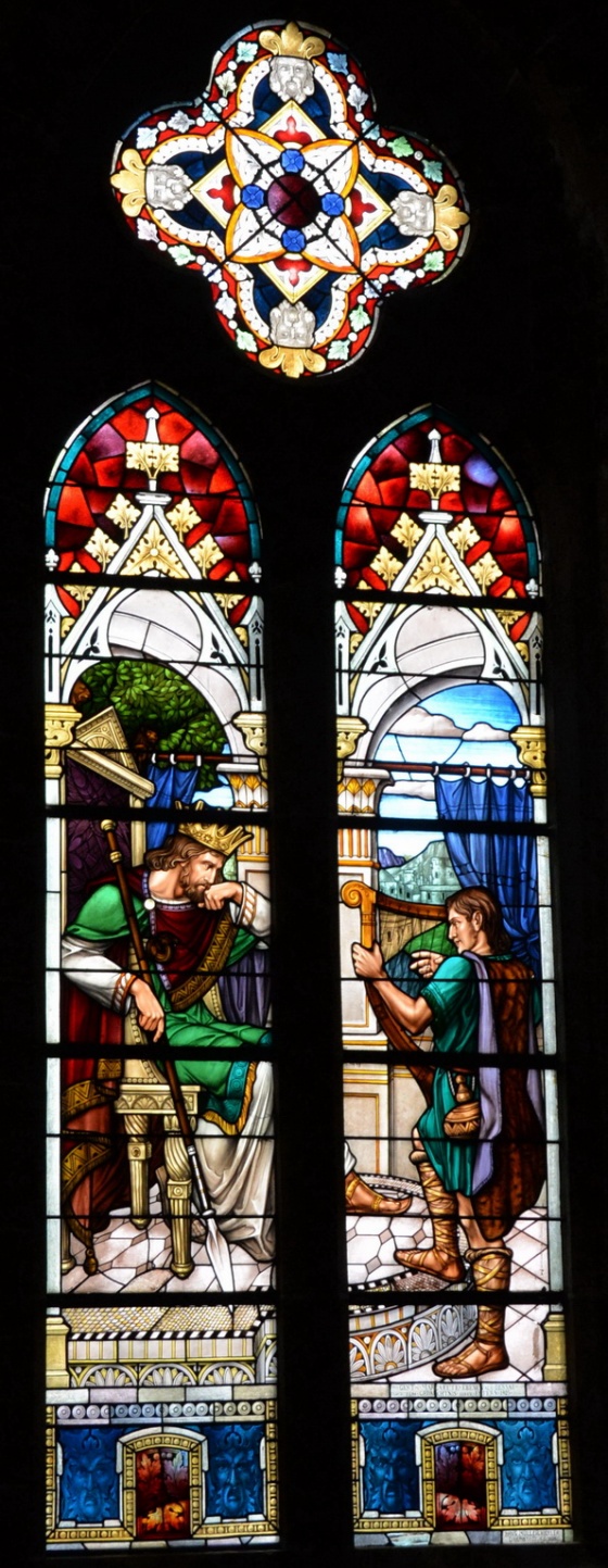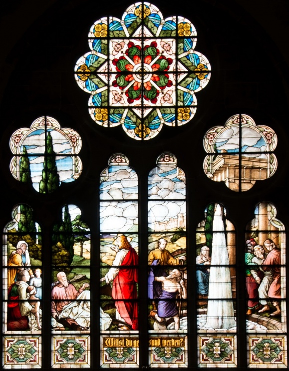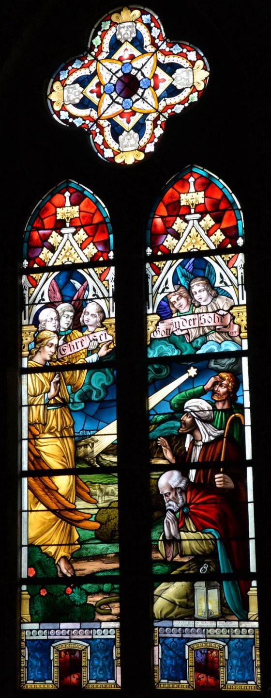 Es ist eine aufsteigende Linie. Die Bilder korrespondieren untereinander: Tod findet sich auch im Weihnachtsbild (Kindermord zu Bethlehem) oder bei der Auferstehung (Wundmale Jesu). Und sie stehen in Kontrast zu den beruhigenden, eher statischen Fenstern darüber, in denen der Tod Jesu als ein Triumph dargestellt wird. Das dicke, pastose Violett erzählt vom Leiden und beschönigt es nicht.