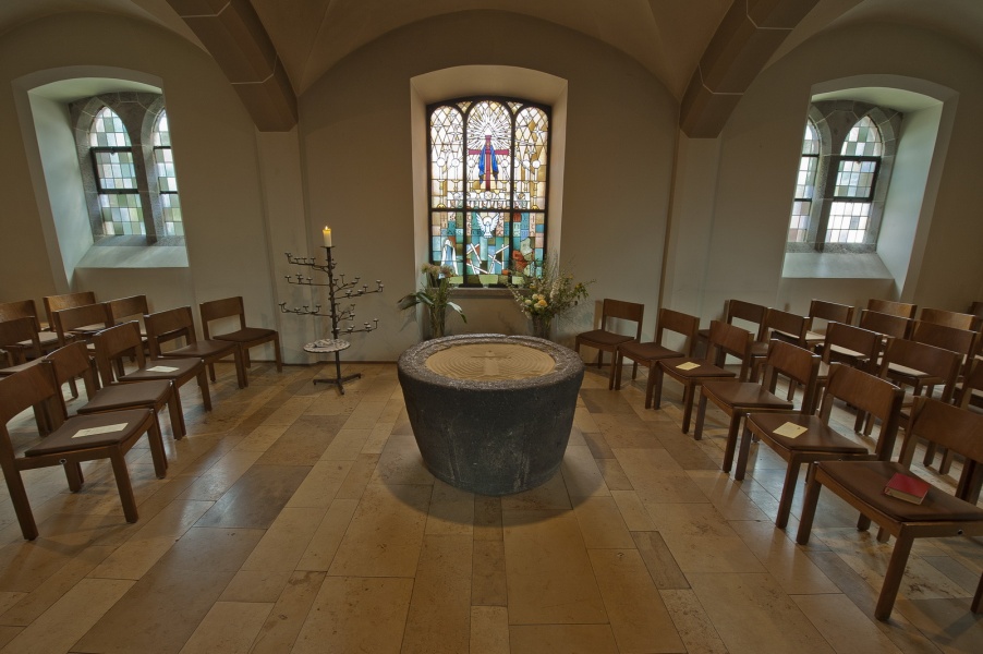 Der untere Bereich des Chorraums wird so zu einem „Raum der Gegenwart“. Der Glanz der Bilder strahlt ab auf die Gemeinde und taucht sie, wenn sie etwa beim Abendmahl in einem Kreis um den Altar steht, in ein besonderes Licht.